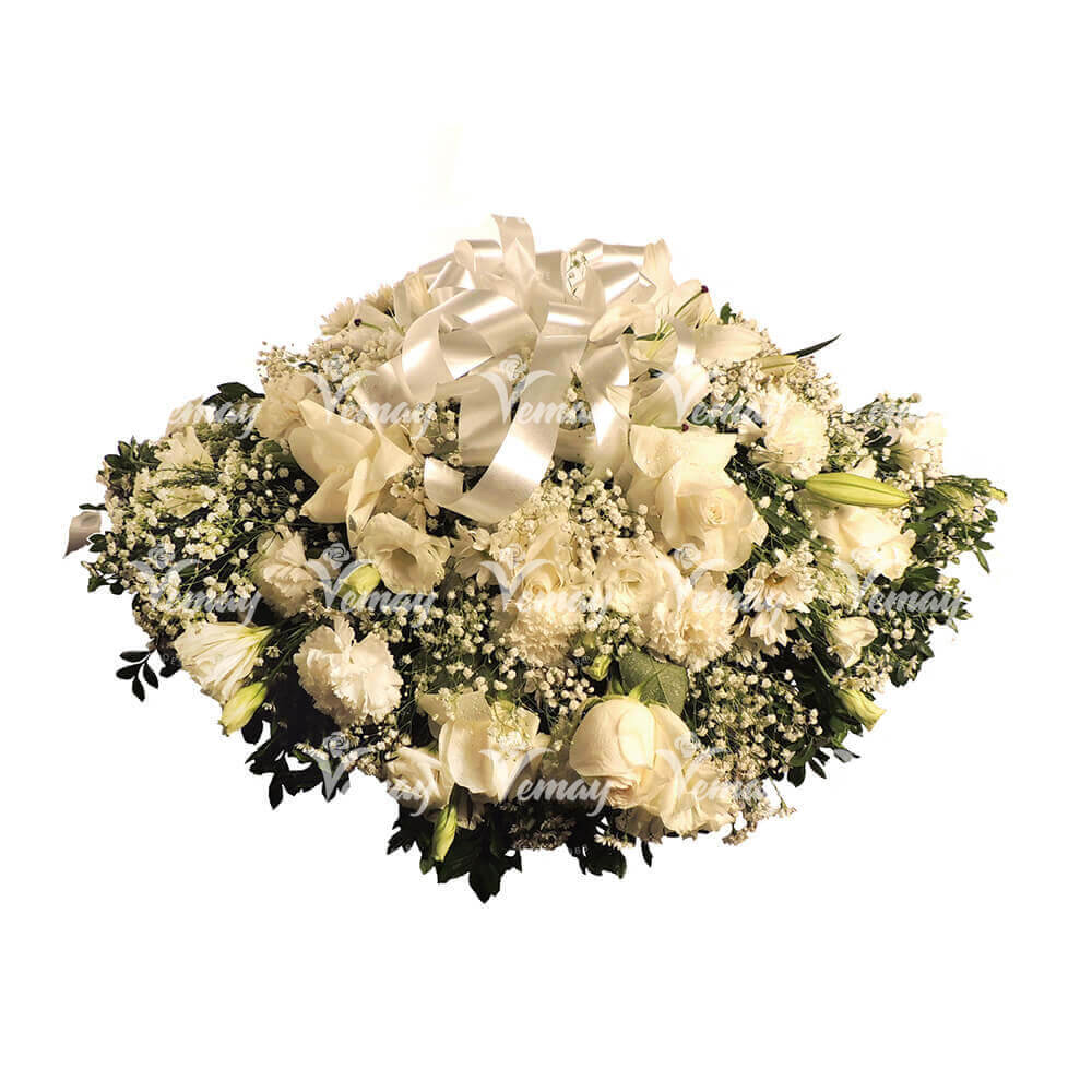 Cruz de crisantemos con detalle de lirios y rosas. El color puede variar se...