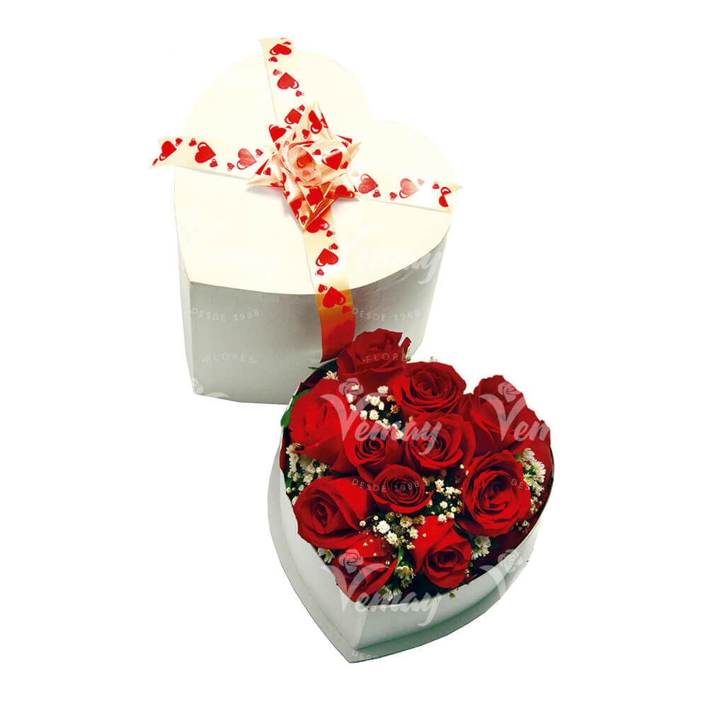 Arreglo presentado en caja en forma de Corazón con detalle de Moño, elaborado con 10 rosas y detalles de gypsofilas.